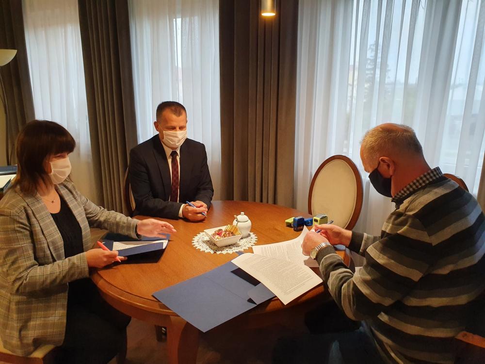 Obrazek Po rozstrzygnięciu przetargu na budowę oświetlenia ulicznego na terenie gminy Tryńcza, dzisiaj wójt Ryszard Jędruch przy kontrasygnacie skarbnika podpisał umowę z Wykonawcą 1. części zadania - Przedsiębiorstwem Energetycznym ELEKTROINSTAL z/s w Przeworsku..