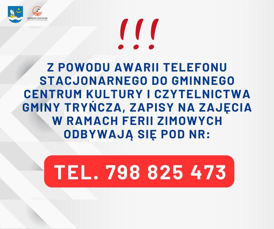 Obrazek Z powodu awarii telefonu stacjonarnego do Gminnego Centrum Kultury i Czytelnictwa Gminy Tryńcza zapisy na zajęcuą odbywają się pod nr tel. 798825473  więcej