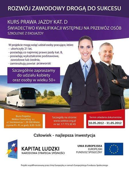 więcejFirma Wektor Consulting s.c. zaprasza pracujące osoby z powiatu przeworskiego do udziału w kursie na prawo jazdy kat. D (autobusy) i kwalifikację zawodową na przewóz osób w ramach projektu „Rozwój zawodowy drogą do sukcesu”...