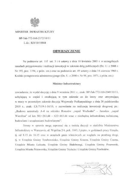 Obwieszczenie informujące o wydaniu przez Ministra Infrastruktury decyzji z dnia 9 września 2011 r. znak: BP-5ak-772-168-2049/10/11,