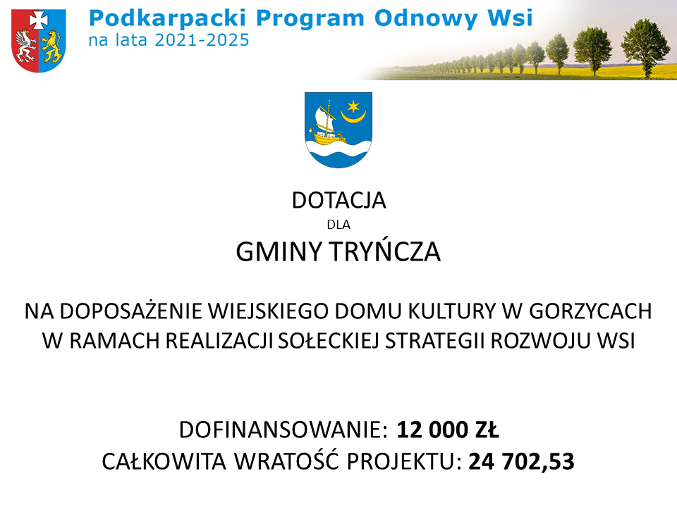 Obrazek Gmina Tryńcza pozyskała dofinansowanie w wysokości 12 tys. zł na zakup nowego wyposażenia do Wiejskiego Domu Kultury w Gorzycach oraz organizację spotkania kulturalno-kulinarnego.. więcej
