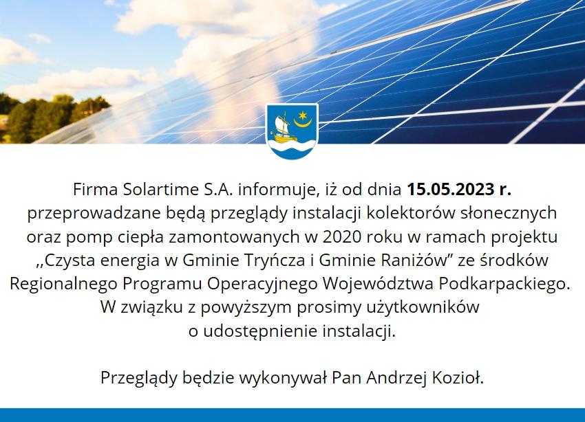 Obrazek Firma Solartime S.A. informuje, iż od dnia 15.05.2023 r. przeprowadzane będą przeglądy instalacji kolektorów słonecznych oraz pomp ciepła ... więcej