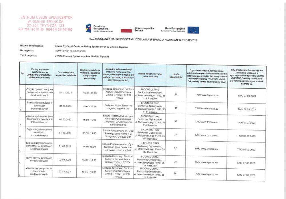 Obrazek SZCZEGÓŁOWY HARMONOGRAM UDZIELANIA WSPARCIA/DZIAŁAŃ W PROJEKCIE "CENTRUM USŁUG SPOŁECZNYCH W GMINIE TRYŃCZA"
