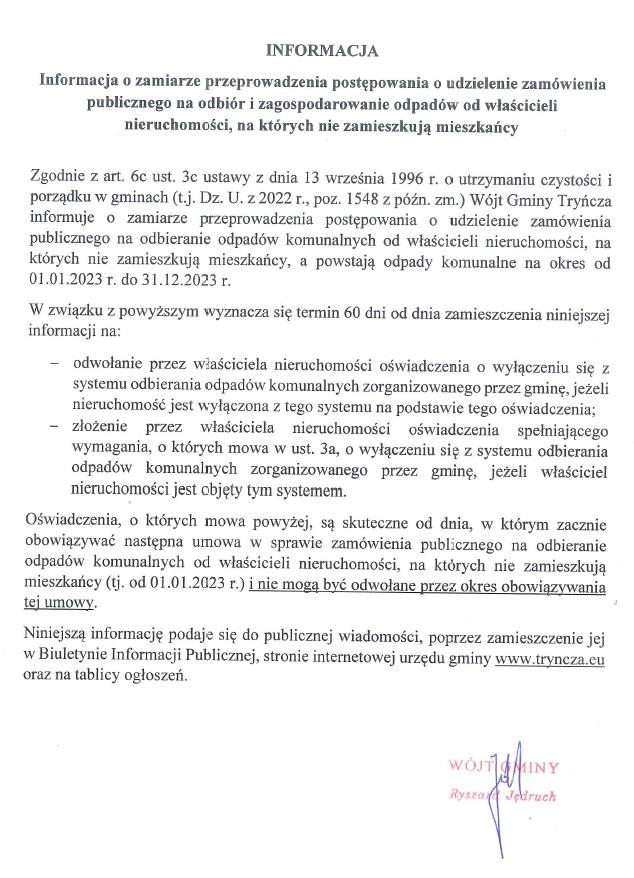 Obrazek Informacja o zamiarze przeprowadzenia postępowania o udzielenie zamówienia publicznego na odbiór i zagospodarowanie odpadów od właścicieli nieruchomości, na których nie zamieszkują mieszkańcy więcej