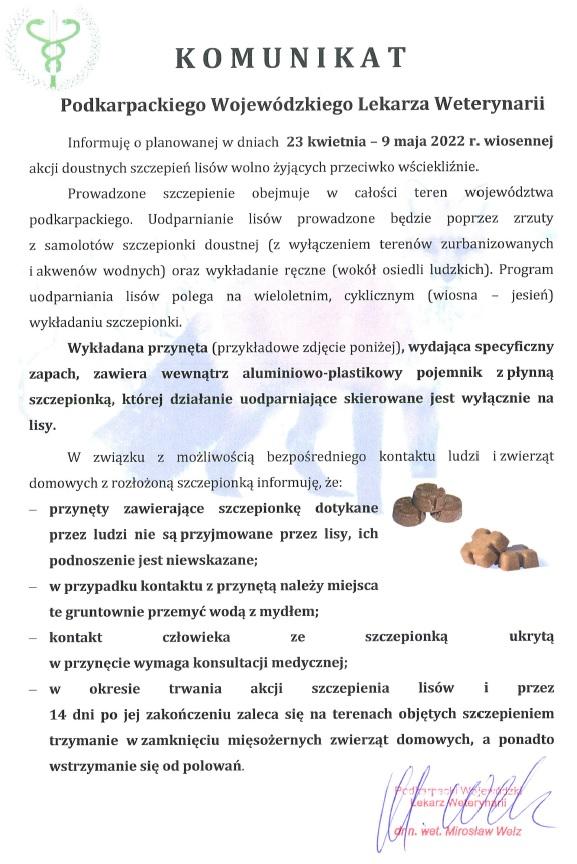 Obrazek Uprzejmie informuję o planowanej w terminie 23 kwietnia - 9 maja 2022 r. wiosennej akcji szczepień lisów wolno żyjących przeciwko wściekliźnie.