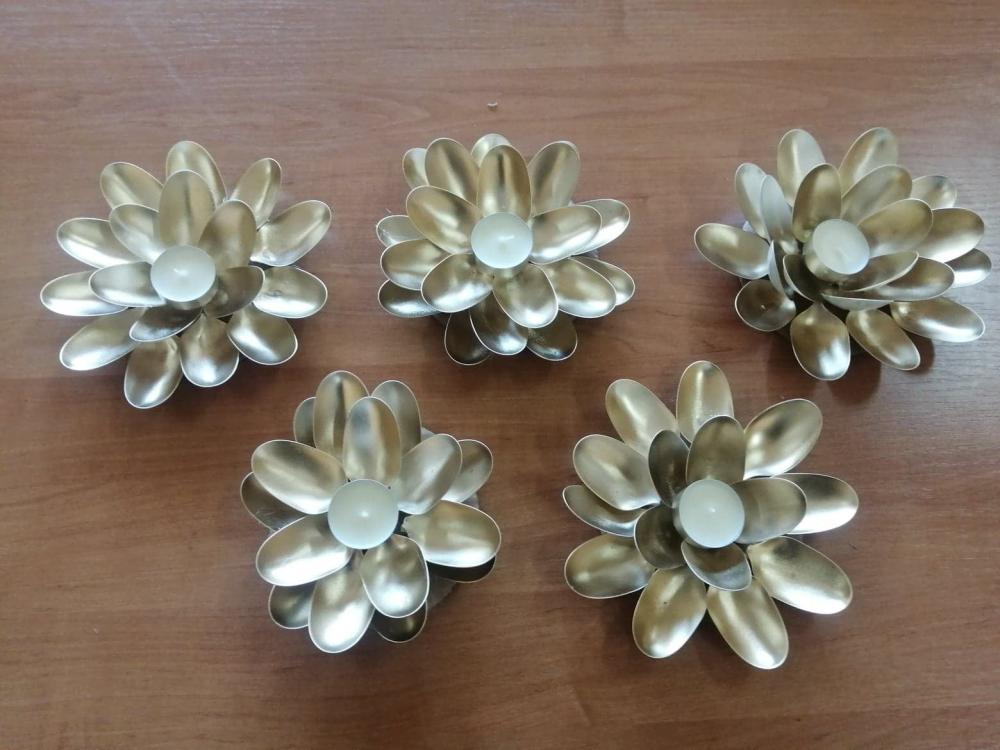 Seniorki za pomocą farby malowały plastikowe łyżki na złoty kolor. Następnie klejem na gorąco przyklejały łyżki na okrągłe podstawki z tektury. Efektem końcowym wspólnie wykonanej pracy są piękne świeczniki.