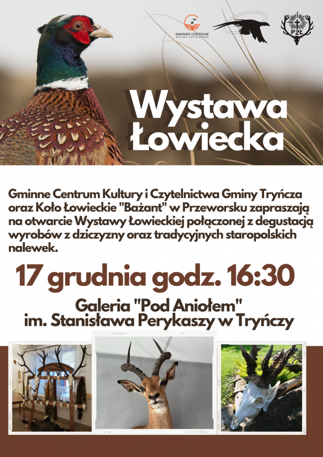 Gminne Centrum Kultury i Czytelnictwa Gminy Tryńcza oraz Koło Łowieckie "Bażant" w Przeworsku zapraszają na otwarcie Wystawy Łowieckiej połączonej z degustacją wyrobów z dziczyzny oraz tradycyjnych staropolskich nalewek.