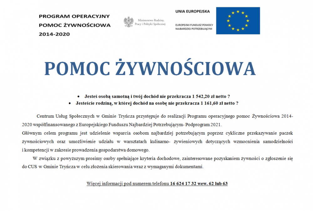 Obrazek Informujemy, iż Centrum Usług Społecznych w Gminie Tryńcza rozpoczęło przyjmowanie wniosków o uzyskanie pomocy żywnościowej.