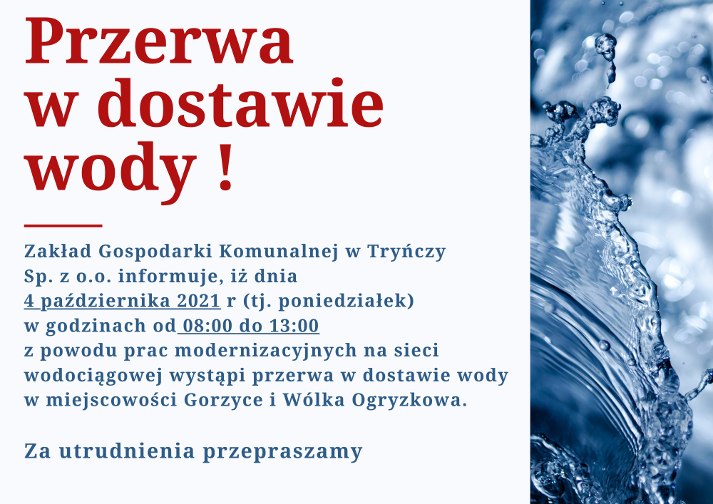 Obrazek Zakład Gospodarki Komunalnej w Tryńczy informuje, że dnia 4 października 2021 r. wystąpi przerwa w dostawie wody więcej