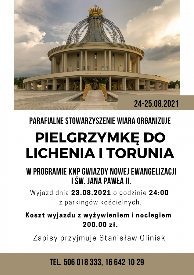 Obrazek Parafialne stowarzyszenie wiara organizuje pielgrzymkę do Lichenia i Torunia w programie knp gwiazdy nowej ewangelizacji i św. jana pawła II. więcej