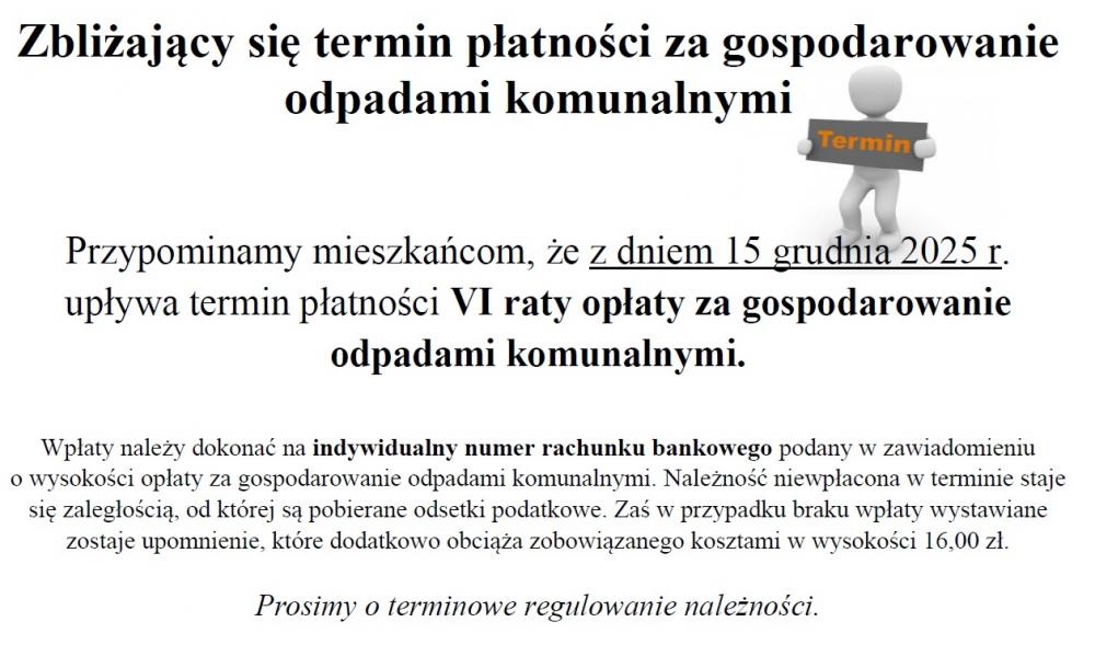 Obrazek Przypominamy mieszkańcom, że z dniem 15 grudnia 2025 r. upływa termin płatności VI raty opłaty za gospodarowanie odpadami komunalnymi. więcej