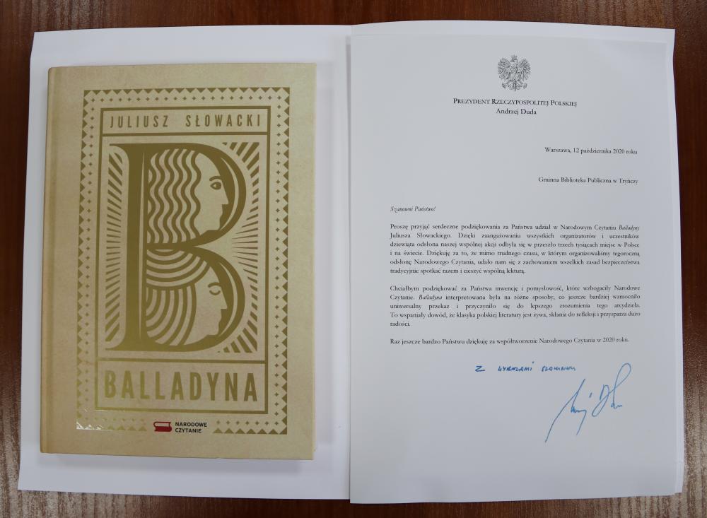 Miło nam poinformować, że Gminna Biblioteka Publiczna w Tryńczy otrzymała podziękowanie od Prezydenta Rzeczypospolitej Polskiej Andrzeja Dudy za udział w dziewiątej odsłonie Narodowego Czytania - "Balladyny" Juliusza Słowackiego...