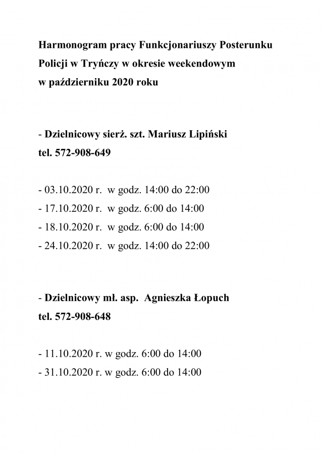 Obrazek Harmonogram pracy Funkcjonariuszy Posterunku Policji w Tryńczy w okresie weekendowym w październiku 2020 roku.. więcej
