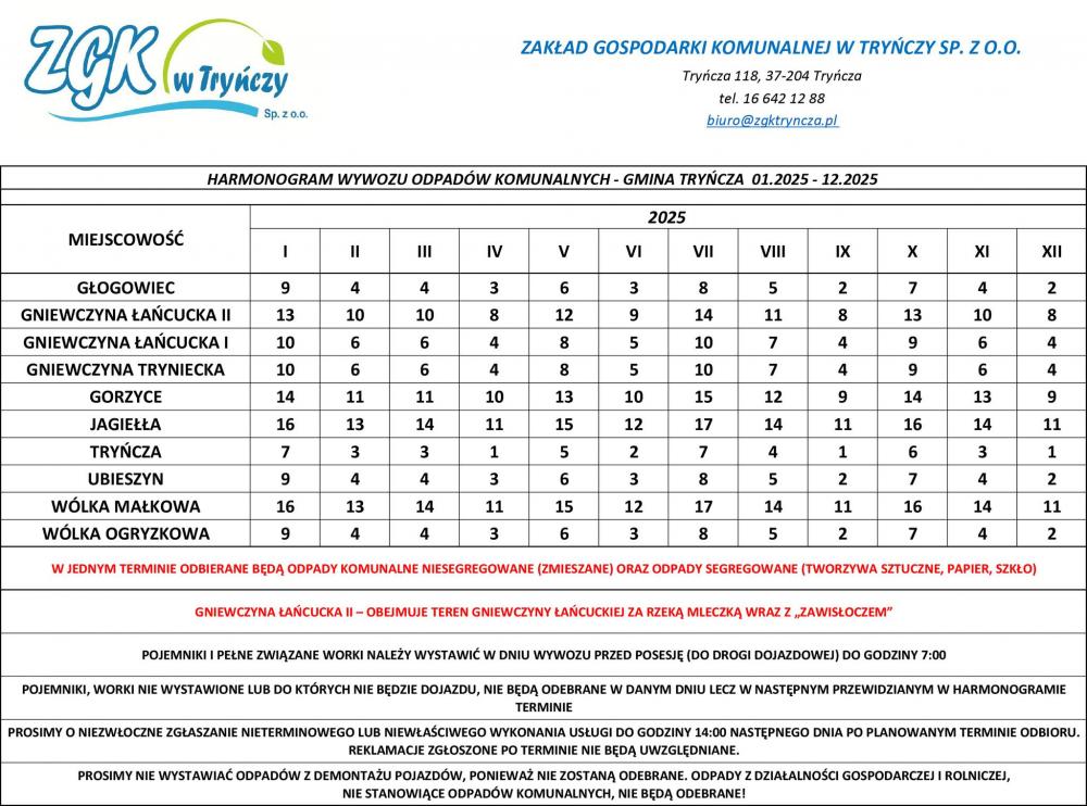 Obrazek Harmonogram Wywozu Odpadów Komunalnych w Gminie Tryńcza 01.2025 - 12.2025 więcej