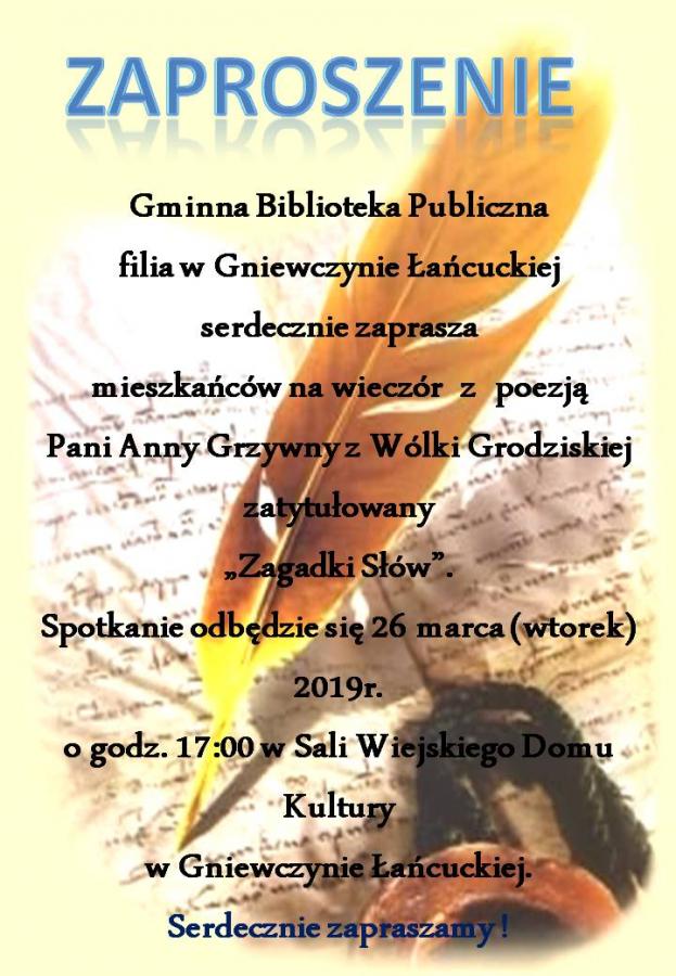 Obrazek W dniu 21 marca br. obchodziliśmy Światowy Dzień Poezji. Z tej okazji Biblioteka Publiczna w Gniewczynie Łańcuckiej przygotowała Wieczór Poetycki ph. „Zagadki słów” młodej poetki z Wólki Grodziskiej, pani Anny Grzywny. Jest to twórczyni należąca do Klubu Poetów Podkarpacia „Perły”.