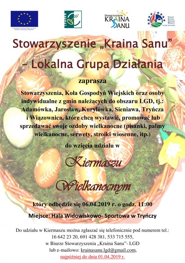 Obrazek Stowarzyszenie "Kraina Sanu" LGD zaprasza na Kiermasz Wielkanocny, który odbędzie się w dniu 6 kwietnia 2019 r. o godz.  11:00 w Hali Widowiskowo-Sportowej w Tryńczy. więcej