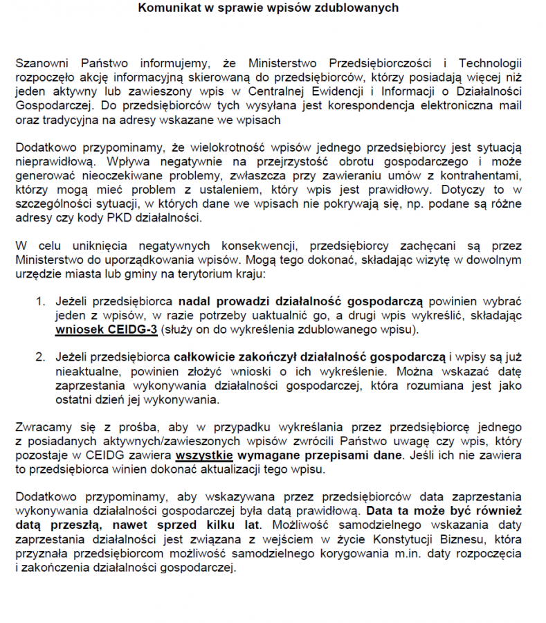 Obrazek Szanowni Państwo informujemy, że Ministerstwo Przedsiębiorczości i Technologii rozpoczęło akcję informacyjną skierowaną do przedsiębiorców, którzy posiadają więcej niż jeden aktywny lub zawieszony wpis w Centralnej Ewidencji i Informacji o Działalności Gospodarczej. Do przedsiębiorców tych wysyłana jest korespondencja elektroniczna mail oraz tradycyjna na adresy wskazane we wpisach. więcej