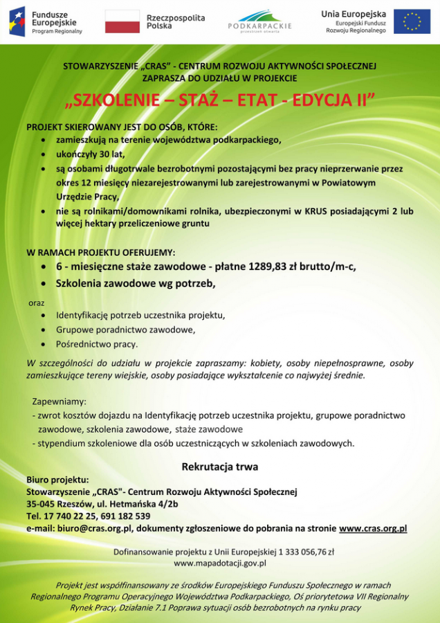 Stowarzyszenie CRAS zaprasza osoby w wieku powyżej 30 lat, długotrwale bezrobotne tj. pozostające bez pracy od ponad 12 miesięcy do udziału w projekcie pn. „Szkolenie – staż – etat - edycja II”.więcej