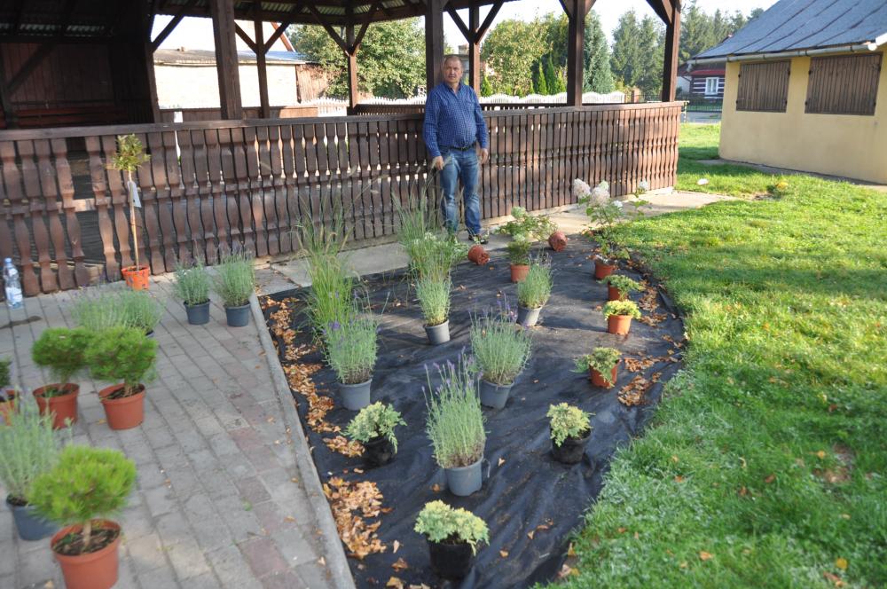 Obrazek Trwa zagospodarowanie terenu zielenią obok grzybka i Wiejskiego Domu Kultury w Ubieszynie. Wokół grzybka zasadzono nowe krzewy i rośliny ozdobne.