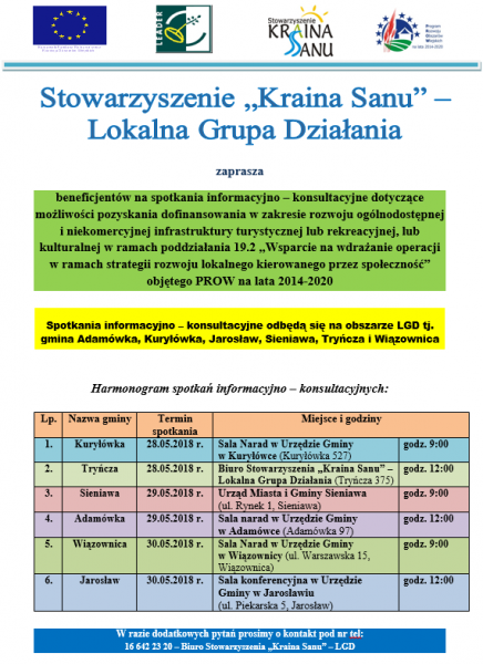 Stowarzyszenie Kraina Sanu zaprasza na spotkania informacyjno – konsultacyjne dotyczące możliwości pozyskania dofinansowania w zakresie rozwoju ogólnodostępnej i niekomercyjnej infrastruktury turystycznej lub rekreacyjnej, lub kulturalnej w ramach poddziałania 19.2 ,,Wsparcie na wdrażanie operacji w ramach strategii rozwoju lokalnego kierowanego przez społeczność”