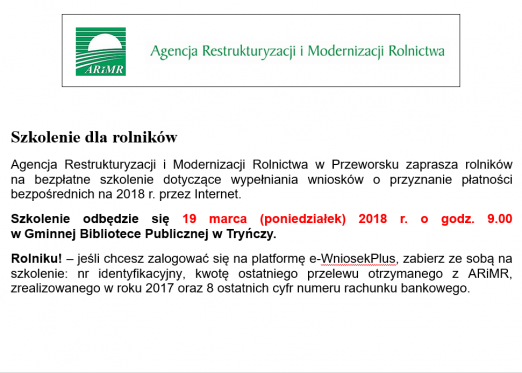 na bezpłatne szkolenie dotyczące wypełniania wniosków o przyznanie płatności bezpośrednich na 2018 r. przez Internet.