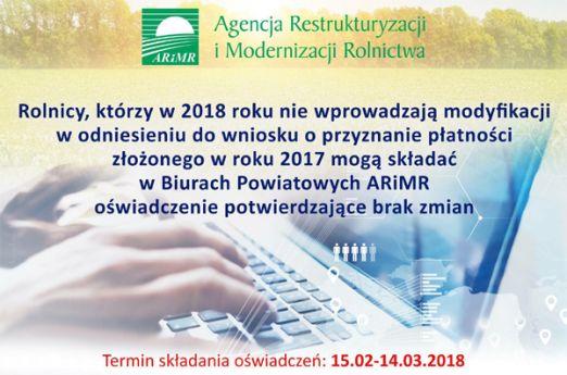 więcejRolnicy, którzy w 2018 roku nie wprowadzają modyfikacji w odniesieniu do wniosku o przyznanie płatności złożonego w 2017 r. do 14 marca mogą składać oświadczenie potwierdzające brak zmian w Biurze Powiatowym ARiMR