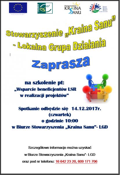 Stowarzyszenie "Kraina Sanu"- LGD serdecznie zaprasza na szkolenie pt: "Wsparcie beneficjentów LSR w realizacji projektów", które odbędzie się 14.12.2017r. o godzinie 10:00 w biurze Stowarzyszenia "Kraina Sanu".