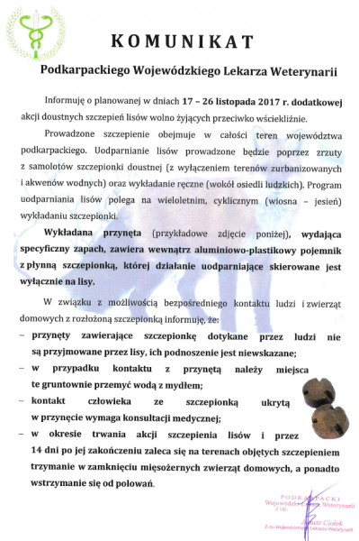 Komunikat Podkarpackiego Wojewódzkiego Lekarza Weterynarii o planowanej w dniach 17-26 listopada dodatkowej akcji doustnych szczepień lisów wolno żyjących przeciwko wściekliźnie.