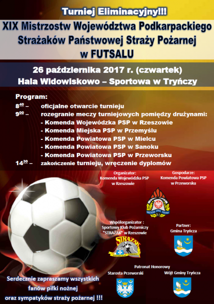Zapraszamy na turniej eliminacyjny XIX Mistrzostw Województwa Podkarpackiego Strażaków Państwowej Straży Pożarnej w Halowej Piłce Nożnej