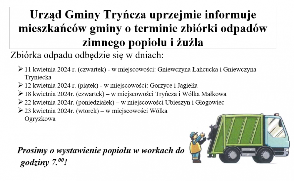 Obrazek Urząd Gminy Tryńczy informuje mieszkańców gminy o terminie zbiórki odpadów zimnego popiołu i żużla więcej