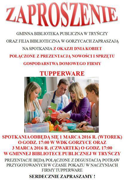 Gminna Biblioteka Publiczna w Tryńczy oraz filia biblioteczna w Gorzycach zapraszają na spotkania z okazji Dnia Kobiet połączone z prezentacją nowości i sprzętu gospodarstwa domowego firmy Tupperware.
