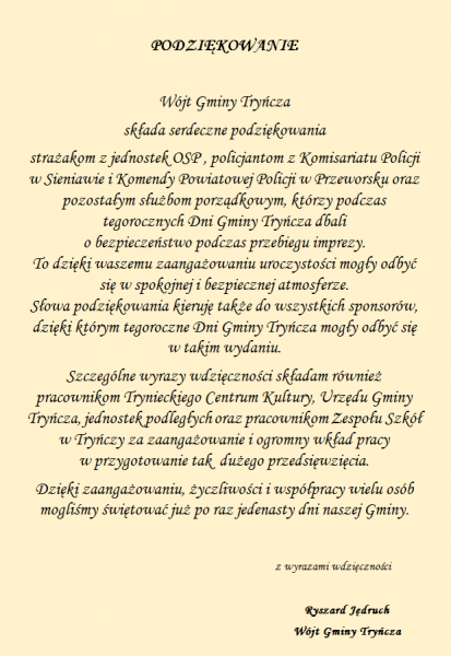 Wójt Gminy Tryńcza składa serdeczne podziękowania...