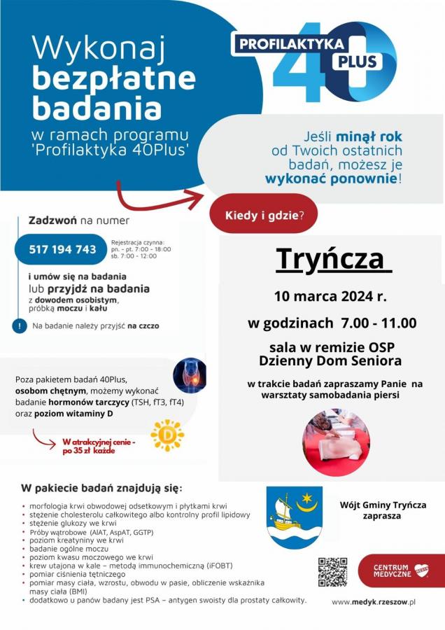 Zapraszamy mieszkańców Gminy Tryńcza do skorzystania z bezpłatnych badań profilaktycznych w ramach programu Profilaktyka 40 plus - 10 marca w Tryńczy