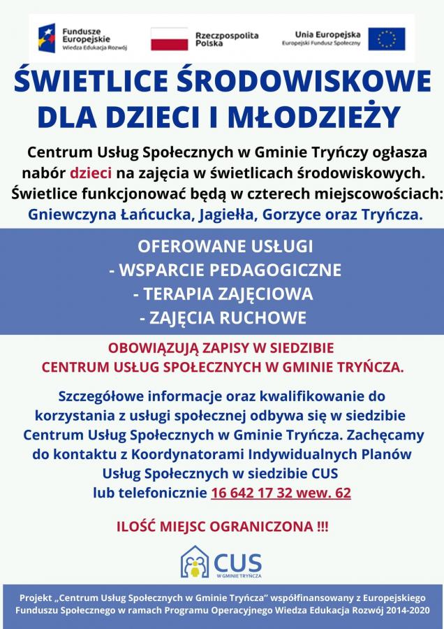 Obrazek Centrum Usług Społecznych w Gminie Tryńczy ogłasza nabór dzieci na zajęcia w świetlicach środowiskowych.