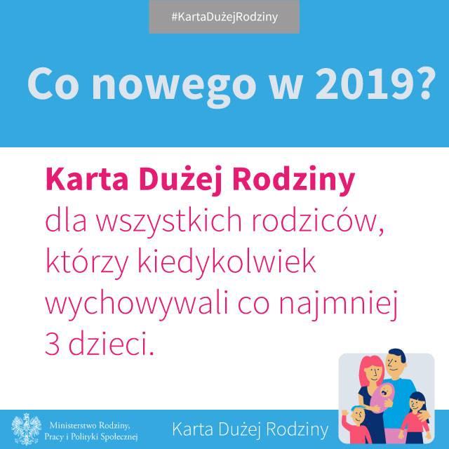 W dniu 1 stycznia 2019 r. weszła w życie istotna zmiana w ustawie o Karcie Dużej Rodziny – od tego dnia o przyznanie KDR będą mogli ubiegać się nie tylko członkowie rodzin, w których w chwili składania wniosku co najmniej troje dzieci spełnia warunki ustawy, ale również rodzice i małżonkowie rodziców, którzy mieli na utrzymaniu łącznie co najmniej troje dzieci, bez względu na wiek tych dzieci w chwili składania wniosku.