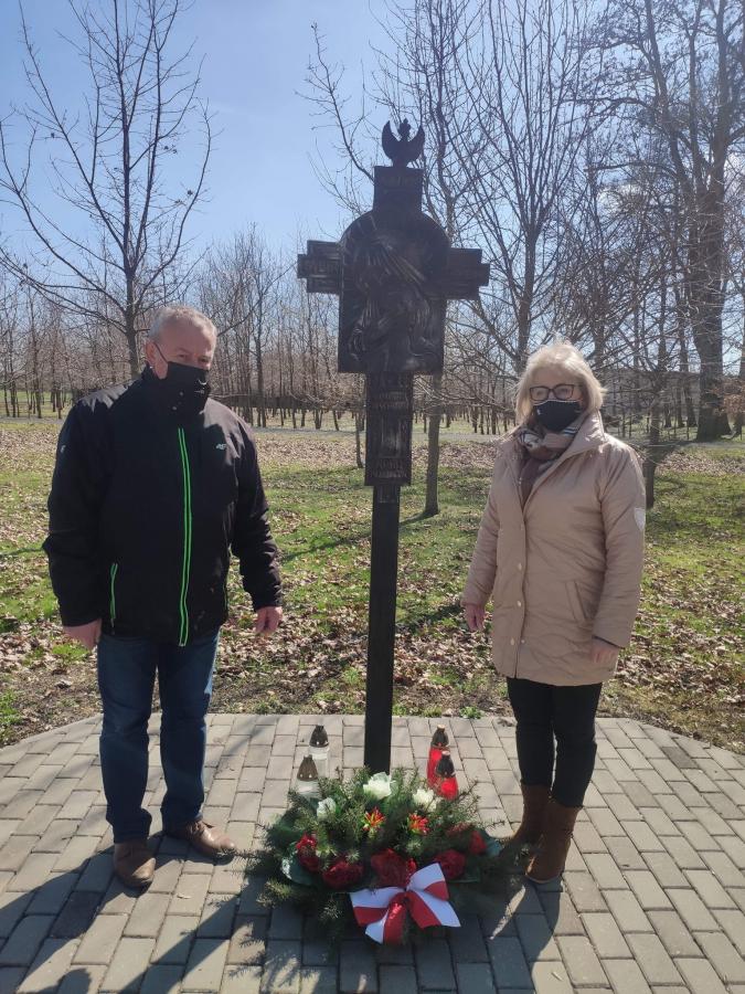 Obrazek ​Pamięci Ofiar Zbrodni Katyńskiej oraz Ofiar katastrofy rządowego samolotu w której zginęło 96 osób, pod krzyżem w parku im. ś.p. Lecha Kaczyńskiego, pracownicy Centrum Kultury w Tryńczy złożyli kwiaty i zapalili znicze..