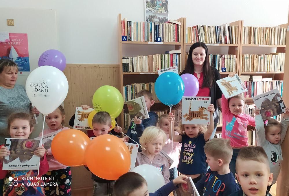 Obrazek W ramach realizacji międzynarodowego projektu edukacyjnego „Mały Miś w świecie Wielkiej Literatury” najmłodsza grupa przedszkolaków  ze szkoły podstawowej wraz z wychowawczynią p.  Iloną Dryś odwiedziły Gminną  Bibliotekę Publiczną  w Tryńczy..