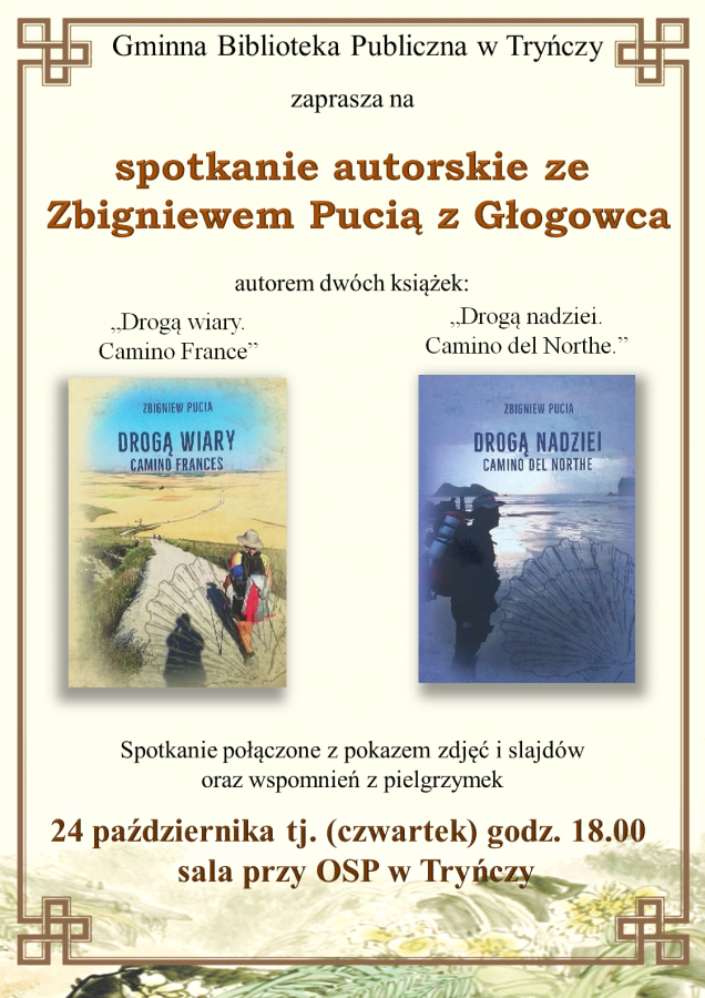 Obrazek W dniu 24 października Gminna Biblioteka Publiczna w Tryńczy zorganizowała spotkanie autorskie ze Zbigniewem i Haliną Pucia z Głogowca  – autorem dwóch książek pt. „Drogą wiary. Camino Frances” oraz „Drogą nadziei. Camino del Norte.”...