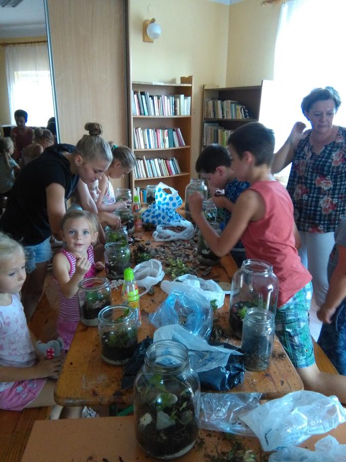 Obrazek W ramach wakacyjnych zajęć biblioteka w Gorzycach zorganizowała ciekawe zajęcia - wykonywanie domowych szklarenek - pod okiem instruktorki Pani Marii Drapała.