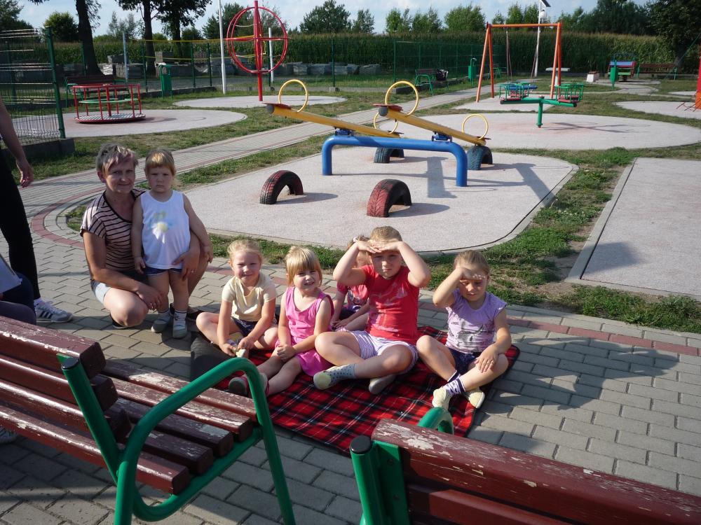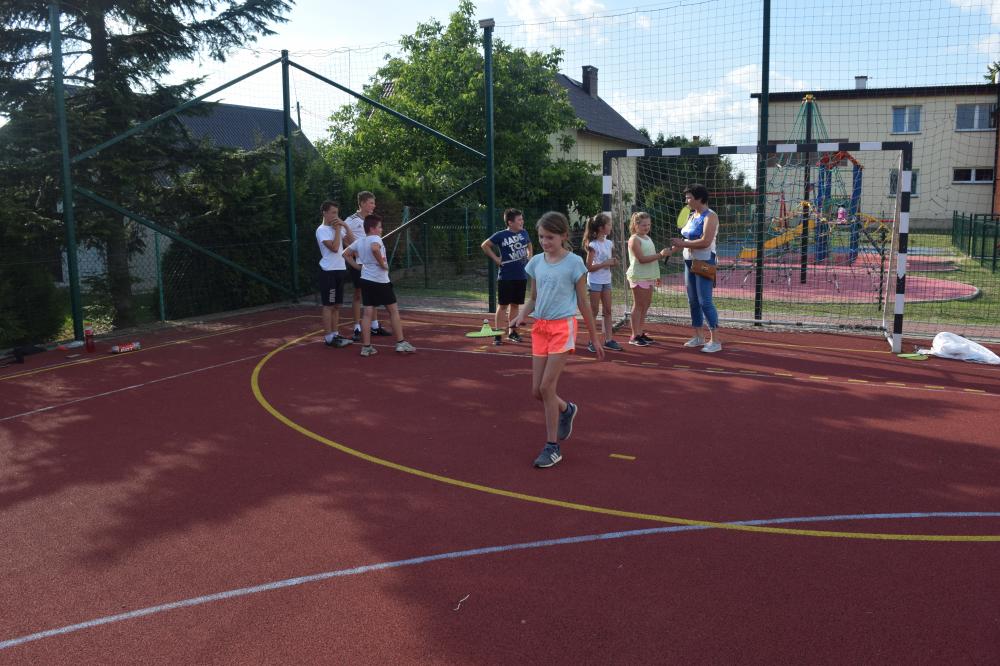 Obrazek Czytanie w plenerze i aktywne zajęcia sportowo - rekreacyjne zorganizowane w ramach wakacyjnych ofert dla najmłodszych na boisku "Orlik" w Gniewczynie przez bibliotekę filia w Gniewczynie Łańcuckiej