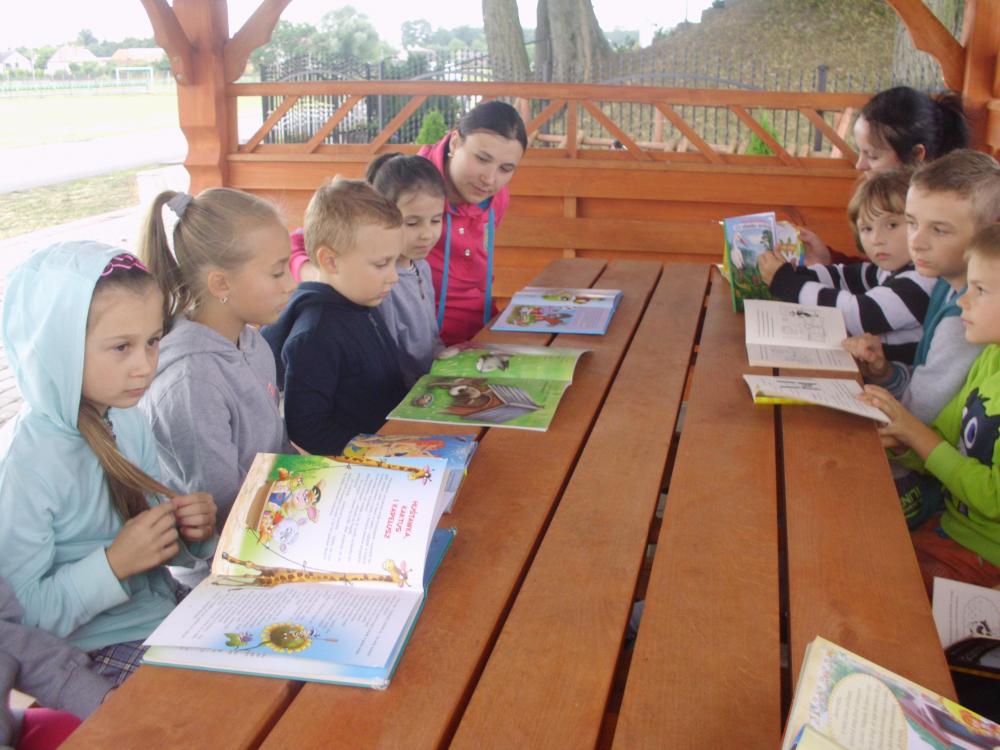 Obrazek Mimo kapryśnej pogody w środowe popołudnie w filii bibliotecznej w Jagielle odbyło się głośne czytanie książek i bajek dla dzieci w plenerze, zorganizowane  w ramach wakacyjnych zajęć dla najmłodszych czytelników..