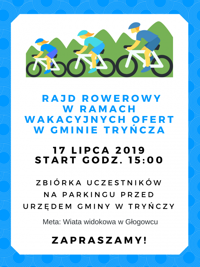 Obrazek Serdecznie zapraszamy na rajd rowerowy w ramach wakacyjnych ofert w Gminie Tryńcza - 17.07.2019 o godz.15:00.. więcej