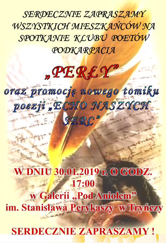Obrazek Serdecznie zapraszamy na spotkanie Klubu Poetów Podkarpacia "Perły" oraz promocję nowego tomiku poezji "Echo Naszych Serc" w dniu 30.01.19 r. o godz. 17:00 więcej