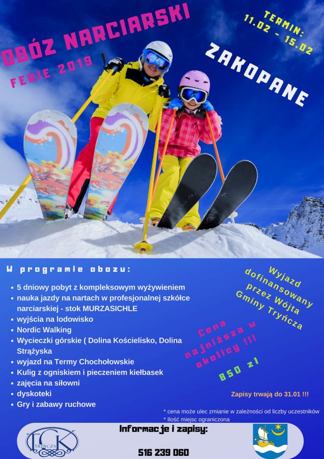Obrazek ZAPRASZAMY WSZYSTKIE CHĘTNE DZIECI Z TERENU GMINY TRYŃCZA DO UDZIAŁU W 5 DNIOWYM OBOZIE NARCIARSKIM  W ZAKOPANEM  !!!