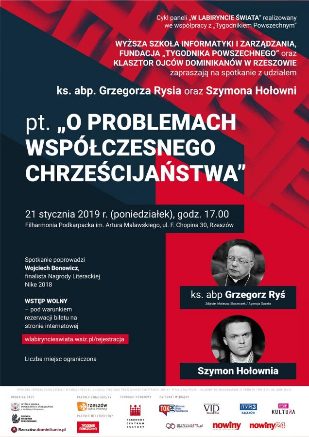 „W labiryncie świata” – o problemach współczesnego chrześcijaństwa dyskutować będą w Rzeszowie metropolita łódzki ksiądz arcybiskup Grzegorz Ryś oraz dziennikarz Szymon Hołownia.