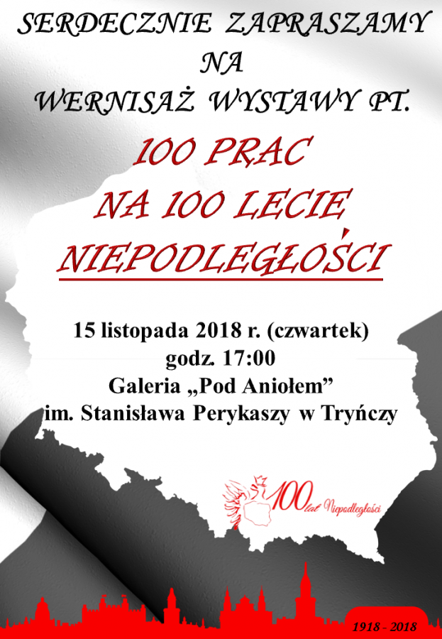 Obrazek Serdecznie zapraszamy na wernisaż wystawy pt. "100 prac na 100 lecie niepodległości", który odbędzie się 15 listopada br. o godz. 17:00 w Galerii "Pod Aniołem" im. Stanisława Perykaszy w Tryńczy. więcej