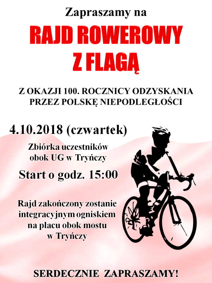 Obrazek Serdecznie zapraszamy wszystkich chętnych na rajd rowerowy z flagą, który odbędzie się w dniu 4.10.2018 r. (czwartek) o godz. 15:00. Zbiórka uczestników obok UG w Tryńczy. więcej