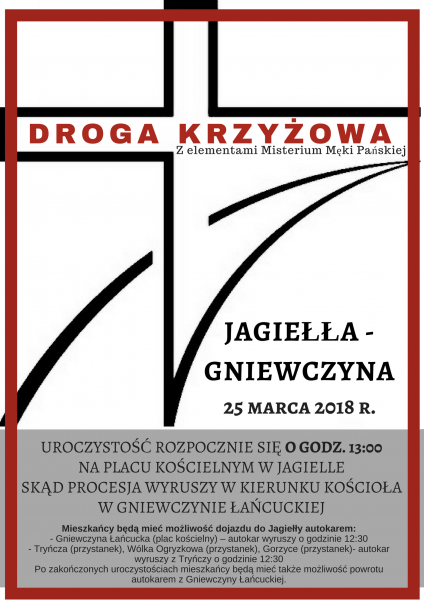 Serdecznie zapraszamy mieszkańców naszej gminy do udziału w Drodze Krzyżowej z elementami Misterium Męki Pańskiej, która odbędzie się w dniu 25 marca 2018 r. o godz. 13:00.