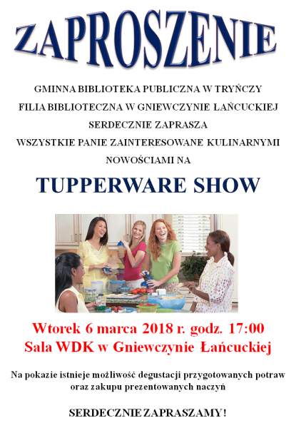 Gminna Biblioteka Publiczna w Tryńczy, filia w Gniewczynie Łańcuckiej serdecznie zaprasza na TUPPERWARE SHOW!