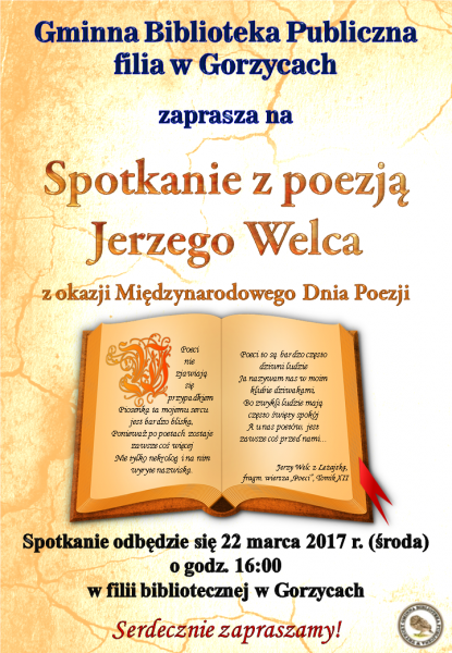 Zapraszamy na spotkanie z poezją Jerzego Welca z okazji Międzynarodowego Dnia Poezji, które odbędzie się dnia 22 marca br. o godz. 16:00 w filii bibliotecznej w Gorzycach.